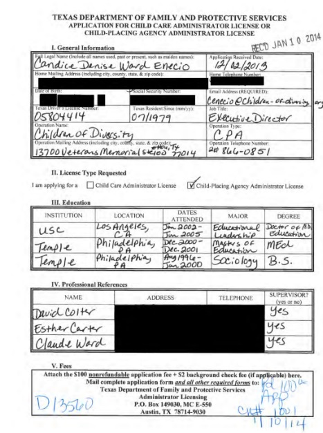 Now we all know that she is going to show up as Dr. Candice Matthews. However, we have learned from her resume that she is a liar. Here is her application to the state of Texas.