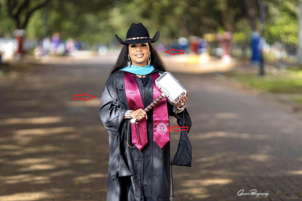 Wait what? This is photo-shopped according to our guys here in the office. They pointed out a couple of things – and sure enough, it is photo-shopped. Now for the fun – we called Texas Southern and asked about her degree. They have no listing. So we asked about honorary. They could not find that either. Strange? Ech…she lied about all of her education. She is nothing but a hood rat, many on the street tell us.